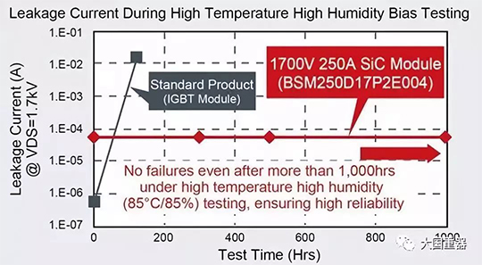 新型BSM250D17P2E004產(chǎn)品引入了一種新的封裝方法和涂層材料,以保護(hù)芯片免受介電擊穿,并抑制漏電流的增加,使模塊能夠通過(guò)HV-H3TRB可靠性測(cè)試。例如,在這種高壓、高溫、高濕度反向偏壓測(cè)試期間,當(dāng)在85°C和85%濕度下施加1360V超過(guò)1000小時(shí)時(shí),器件沒(méi)有出現(xiàn)故障,不同于傳統(tǒng)IGBT模塊,通常在1000小時(shí)以內(nèi)因電介質(zhì)擊穿而導(dǎo)致失效。為確保最高水平的可靠性,ROHM以不同的間隔測(cè)試了模塊的漏電流,最高阻斷電壓為1700V。